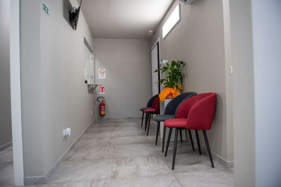Un couloir étroit aux murs gris clair aménagé avec des chaises rouges et grises et une plante verte en fond.